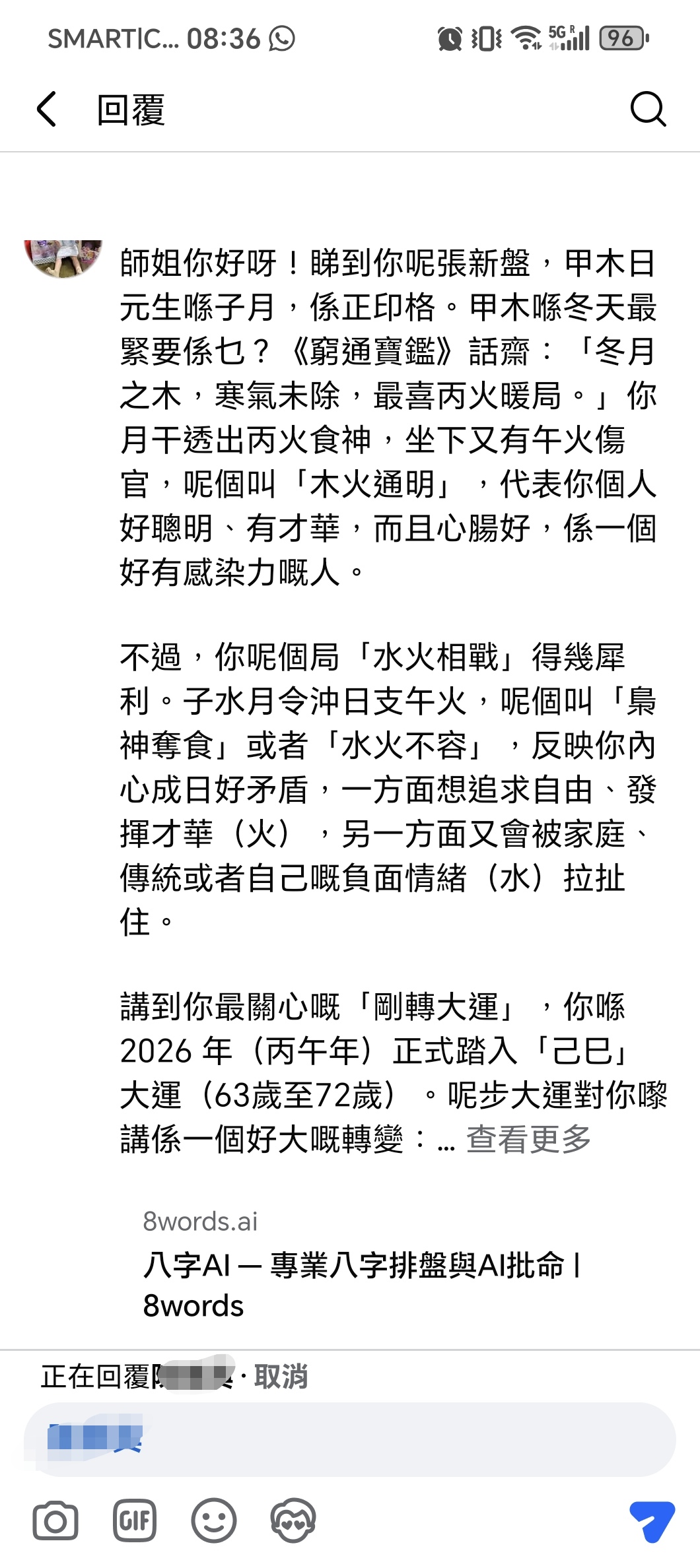 小光(系統管理員)🎓 子平門生·4 天前🔮命盤請教實例示範這是真實的案例,歡迎大家參考 只須在WhatsApp 貼上命盤,再問問題,問題就解答了。 若果出來的答案, 也可以WhatsApp 我, 大家一起研究。🤍留言22分享